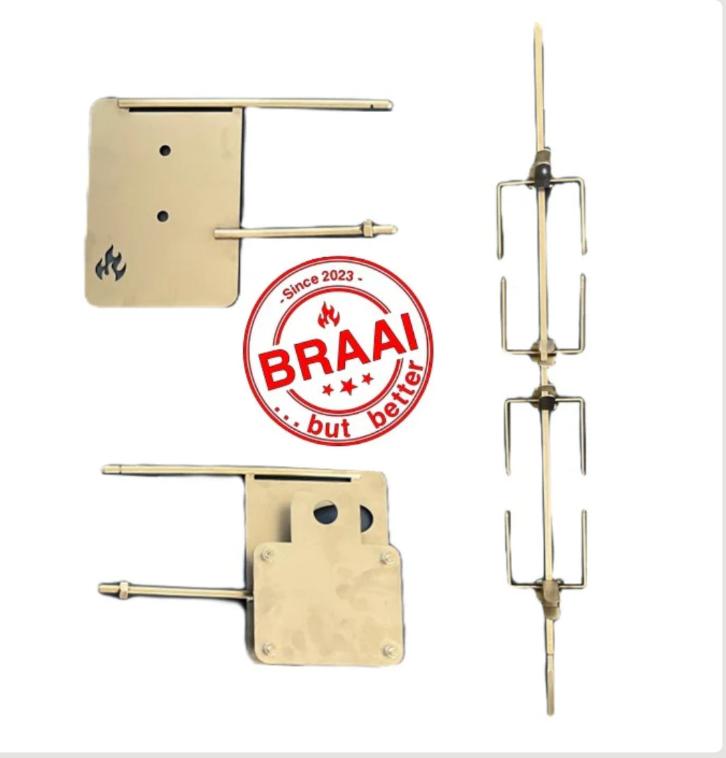 Designed to clip onto the Patented KamaSutra Braai Back Plate. One plate left where motor clips on and the other plate on the right. The rotisserie rod extends from left to right. The Rotisserie Mount Set turns your KamaSutra Braai into a Spit Braai.